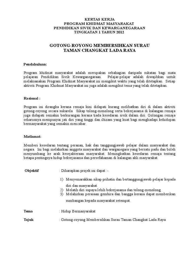 Memupuk serta mengaplikasi pengetahuan kemahiran dan amalan nilai sivik dalam diri setiap individu. Share KERTAS KERJA GOTONG ROYONG PERDANA 2019. CONTOH KERTAS KERJA PROGRAM GOTONG ROYONG 2012 - October 11 2012 KERTAS KERJA PROGRAM GOTONG ROYONG 2012 Pendahuluan Sekolah akan mengadakan program gotong royong 2012 Murid bersama-sama guru akan membersihkan kawasan sekolah serta memulihara taman-taman dan mempertingkatkan kebersihan serta keceriaan kawasan.